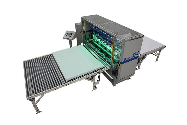 - Gravity conveyor feeds stacked foam layers into XT9.